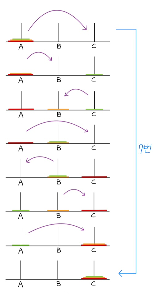 하노이 탑은 3개의 막대가 있고 원반을 목표 막대로 옮기는 과정이다.