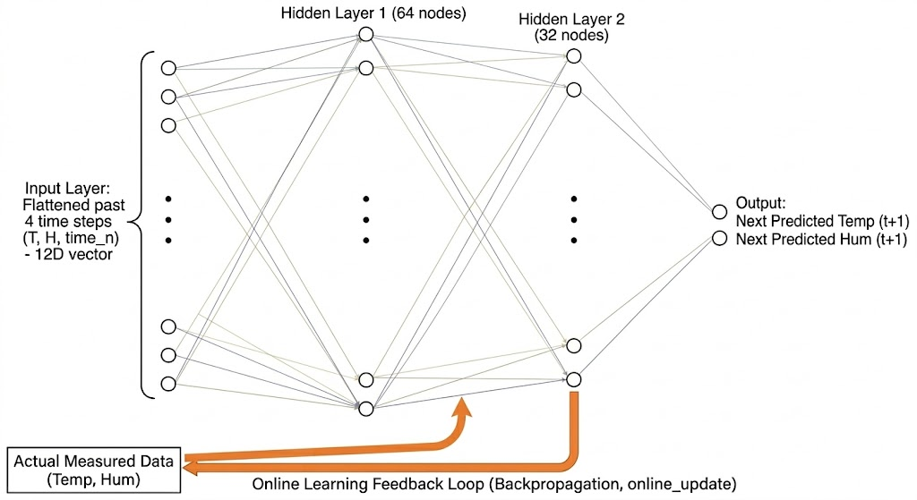구조: 입력 12(과거 4시점의 온도·습도·time_n을 펼친 벡터) → 은닉층 64(ReLU) → 은닉층 32(ReLU) → 출력 2(예측 온도, 예측 습도). 엣지와 게이트웨이에 동일한 구조·가중치를 둔다.