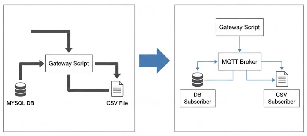 원래는 게이트웨이가 수신할 때 DB와 CSV에 직접 쓰는 구조였다. DB 연결 실패나 CSV 쓰기 실패가 나면 한 경로 장애가 전체 저장 실패로 이어질 수 있어서, 게이트웨이는 수신 시 MQTT로 한 번만 발행하도록 바꿨다. DB 저장은 “RX만 MySQL readings 테이블에 insert하는 구독자”, CSV 저장은 “RX·EST 모두 experiment_log_online.csv에 append하는 구독자”가 각각 구독해 처리한다. 발행부와 저장부를 분리해 장애 격리가 되었고, 나중에 저장 채널을 추가하거나(예: 다른 DB, 다른 파일) 변경할 때도 구독자만 추가·수정하면 된다.