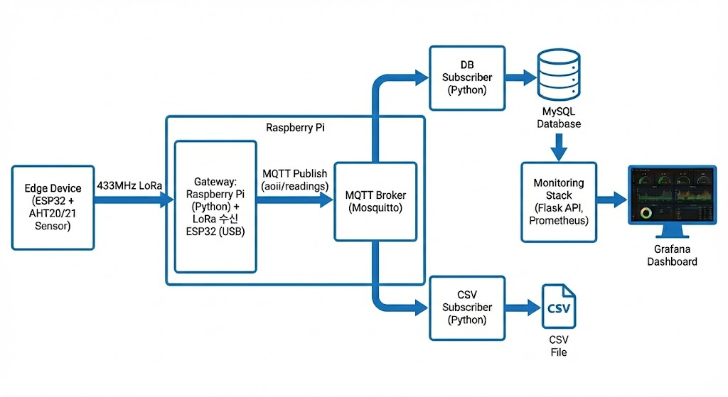 이 프로젝트에서 나는 데이터 파이프라인 설계·구현, 설정·저장·모니터링 정리, 그리고 장애 지점 파악·보완 과제 정리를 맡았다. 엣지 펌웨어나 LoRa 통신 프로토콜 자체보다는, 게이트웨이가 받은 패킷을 어디로 보낼지(한 번만 MQTT 발행), 누가 DB에 넣고 누가 CSV에 넣을지(구독자 분리), 시리얼 포트·MQTT 브로커 주소·DB 비밀번호는 어디에 두는지(.env 단일 소스), DB·CSV·대시보드의 시간을 어떻게 맞출지(로컬 시간 저장), 파이프라인 어디가 끊기면 어떤 영향인지(장애 지점 표), 장애가 생기면 무엇을 더 해야 하는지(QoS·DLQ·재시도·백업·런북 등)를 문서와 코드로 정리하는 쪽에 기여했다.